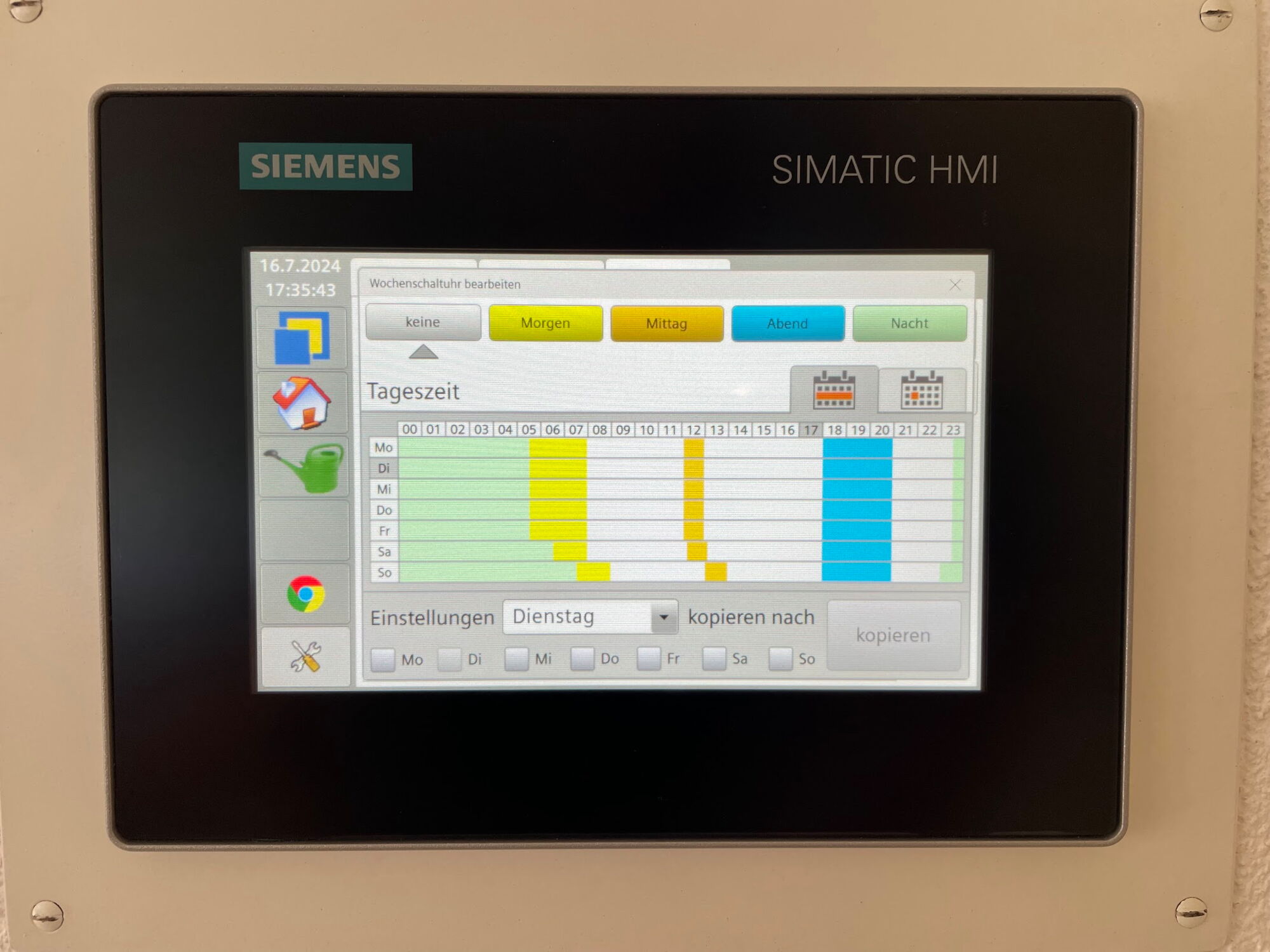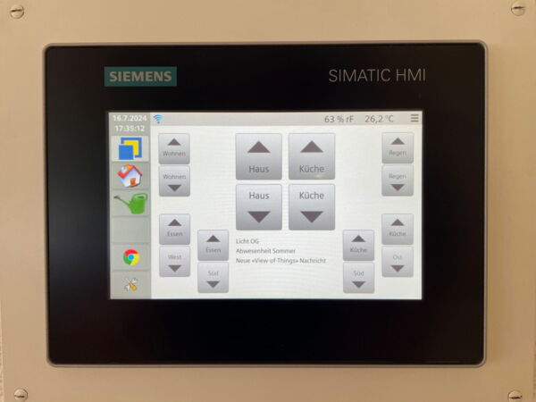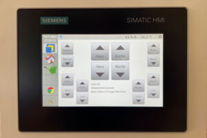 Damit im Küchenbereich nicht zu viele Taster montiert werden mussten, wurde ein Touch-Panel eingebaut. Das Panel wurde in die Mauer eingelassen, darum musste ein Blech verwendet werden. Damit kein Wärmestau entsteht, wurden auf der Rückseite der Mauer je zwei 21er Rohre oben und unten in den Holzeinlasskasten verlegt.